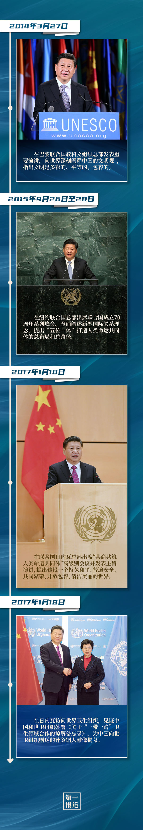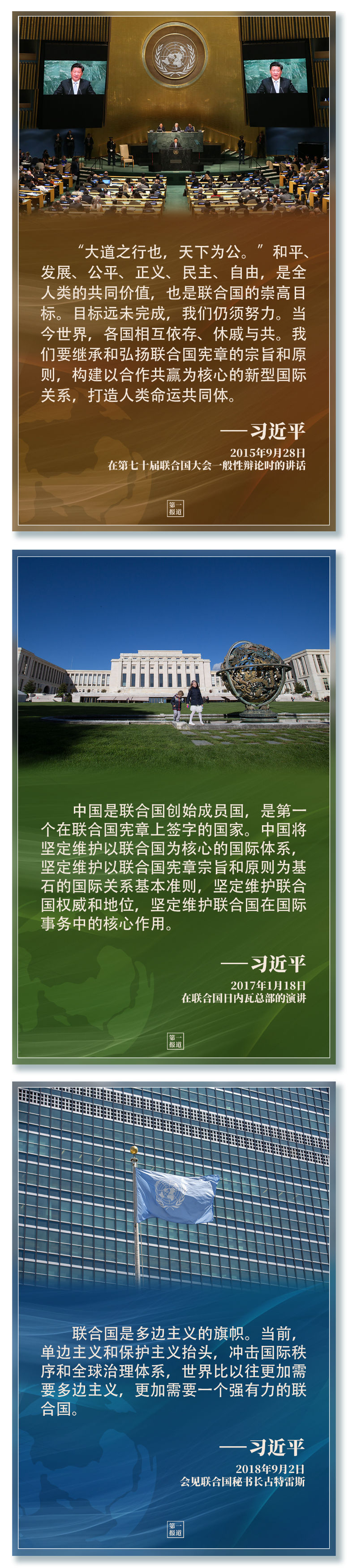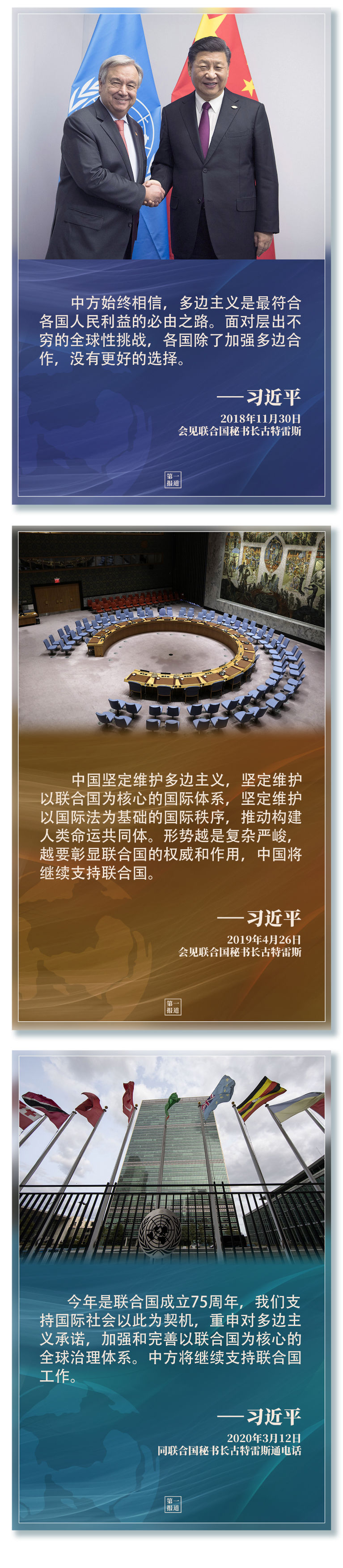 習主席指出,“支持聯(lián)合國發(fā)揮作用,維護聯(lián)合國權威和地位,是中國外交一項基本政策?!?/strong>2013年以來,習主席多次會見聯(lián)合國主要官員,訪問聯(lián)合國總部及聯(lián)合國專門機構,出席一系列聯(lián)合國活動……親自推動中國同聯(lián)合國的合作,發(fā)出支持聯(lián)合國事業(yè)、捍衛(wèi)多邊主義的中國強音。
