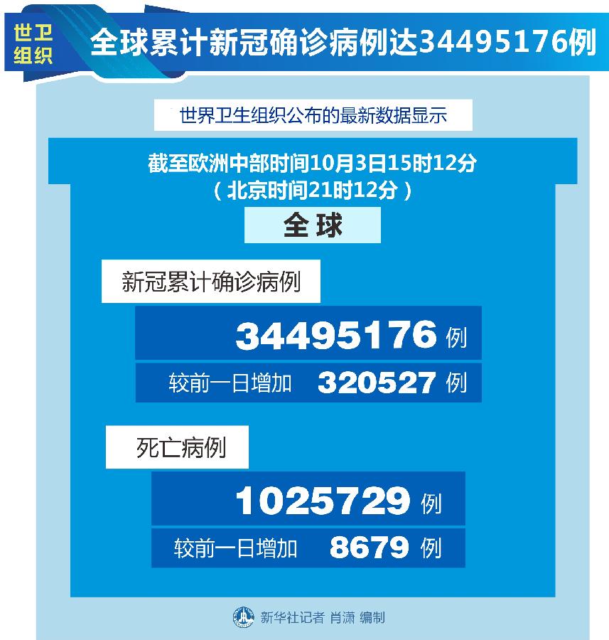 世衛(wèi)組織網(wǎng)站最新數(shù)據(jù)顯示,截至歐洲中部時間3日15時12分(北京時間21時12分),全球確診病例較前一日增加320527例,達(dá)到34495176例;死亡病例增加8679例,達(dá)到1025729例。