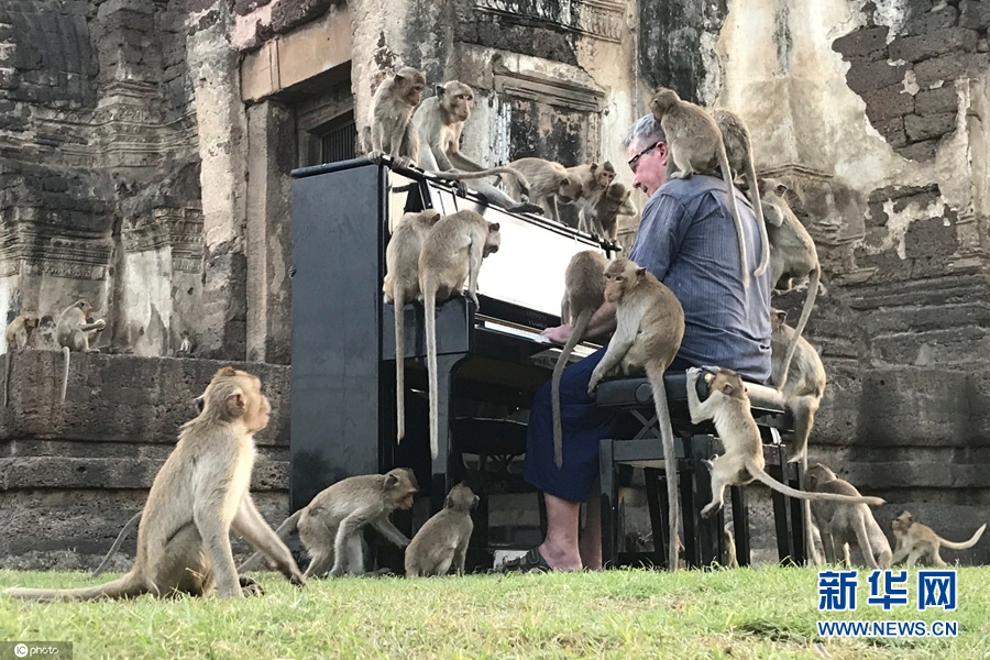 11月21日,泰國(guó)華富里府,英國(guó)鋼琴家保羅·巴頓(Paul Barton)為一群猴子彈鋼琴。演奏過(guò)程中,多只猴子在他周圍跑來(lái)跑去,有幾只還爬上了鋼琴,甚至在他的頭頂跳來(lái)跳去。巴頓稱,這場(chǎng)特殊的音樂(lè)會(huì)旨在引起人們對(duì)這群饑餓的猴子的重視。(圖片來(lái)源:東方IC)