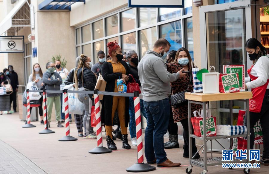11月27日,人們在美國馬里蘭州國家港灣一處購物中心排隊(duì)等待進(jìn)店購物。