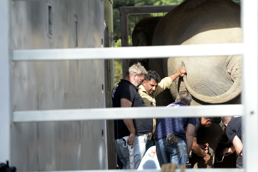 ↑11月29日,在巴基斯坦伊斯蘭堡,工作人員搬運裝有大象的運輸箱