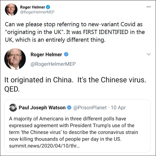 英國出現(xiàn)變異新冠病毒后,世衛(wèi)組織(WHO)將起源地列為英國,不少主流媒體也引用了相關(guān)言論。但這讓英國右翼政黨獨(dú)立黨(UKIP)成員,曾擔(dān)任歐洲議會(huì)議員羅杰·赫爾默坐不住了。