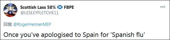 另一名網(wǎng)友接茬說:“只要你為‘西班牙流感’向西班牙道歉?!焙諣柲苍栌谩拔靼嘌懒鞲小保瑸椤爸袊鞲小钡恼f法狡辯。