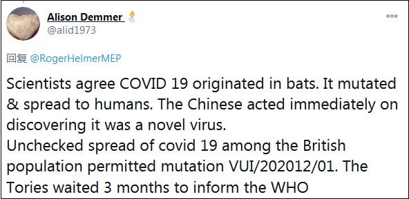 還有一名網(wǎng)友對(duì)比稱:“科學(xué)家同意新冠病毒起源自蝙蝠,變異后傳播給人類,中國人發(fā)現(xiàn)這是一種新病毒后,立即采取了行動(dòng)。新冠病毒在英國人口中無限制的傳播,導(dǎo)致了變異新冠病毒(VUI/202012/01),保守黨等了3個(gè)月才通知世衛(wèi)組織。”