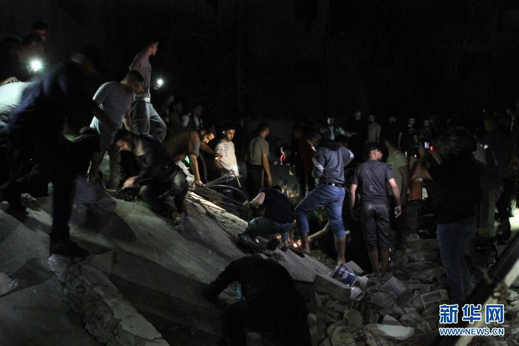 5月15日,人們聚集在加沙城一處遭空襲的難民營。