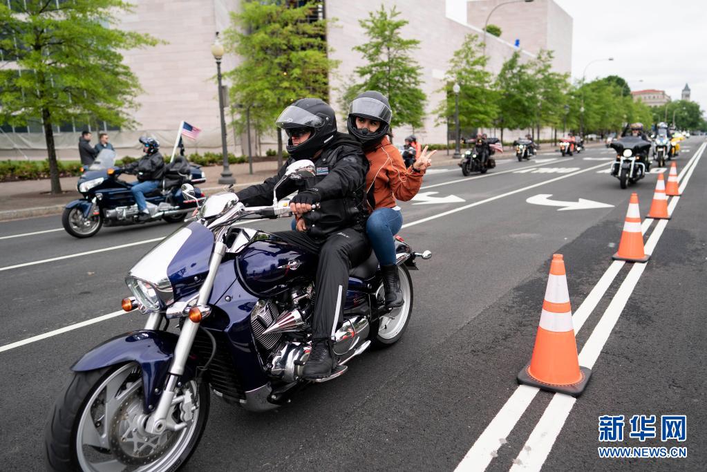 5月30日,在美國首都華盛頓,參加“滾雷”摩托車大游行的車輛駛過街頭。