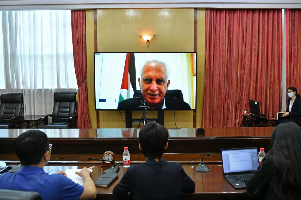 5月27日,巴勒斯坦人民黨總書記巴薩姆·薩利希通過視頻連線接受記者采訪。新華社記者李鑫攝